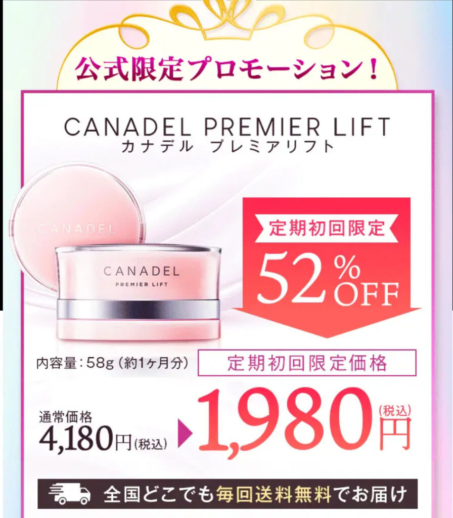 公式サイトでは、カナデルプレミアリフトを初回は定価の52%OFFの1980円で購入できます!